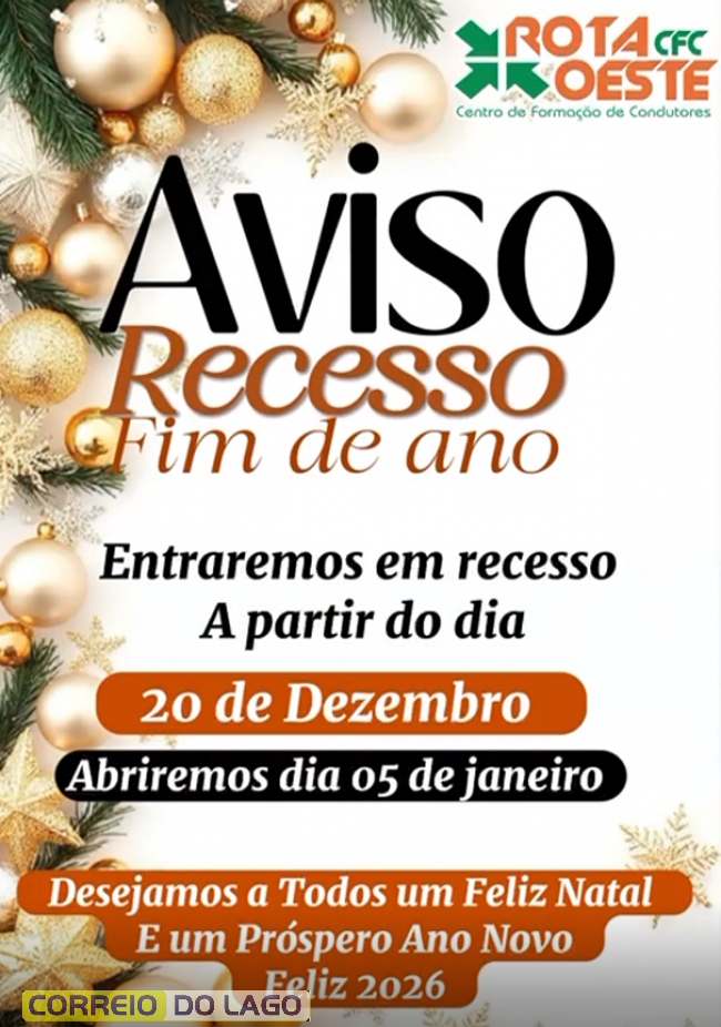 O CFC Rota Oeste, em Santa Helena, informa que entrará em recesso de fim de ano a partir do dia 20 de dezembro. Durante esse período, as aulas e atendimentos estarão suspensos.