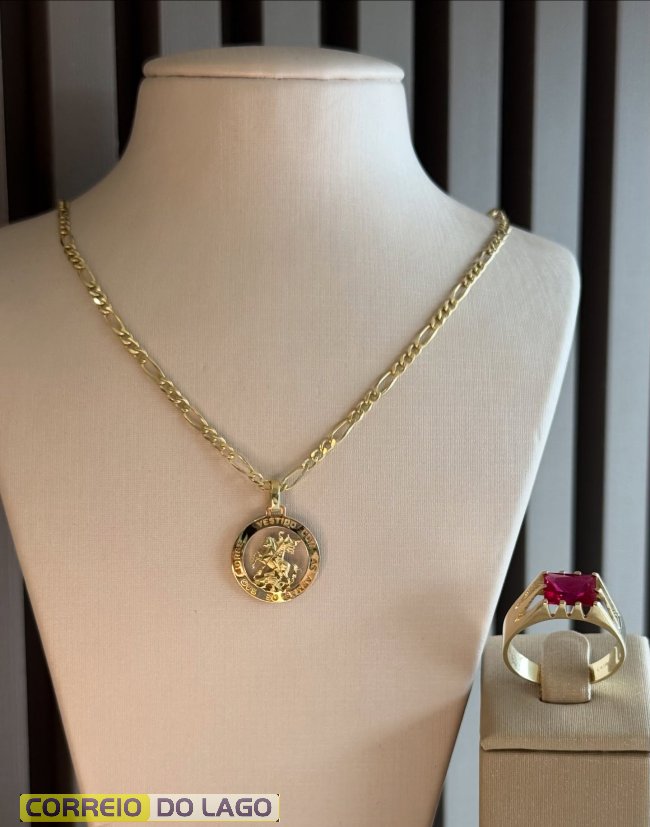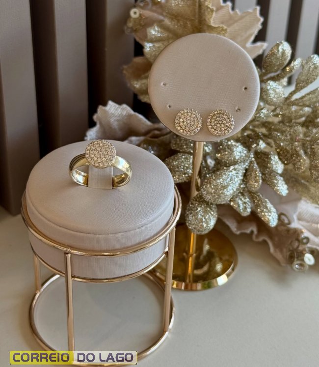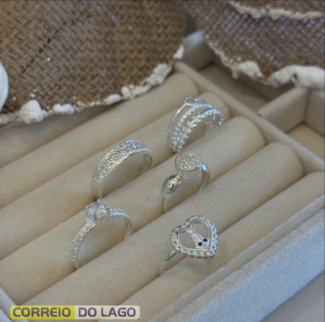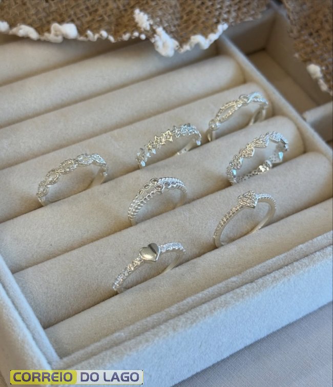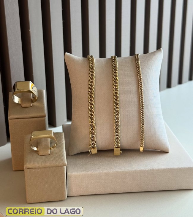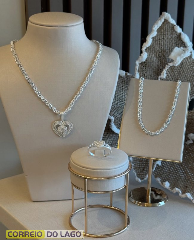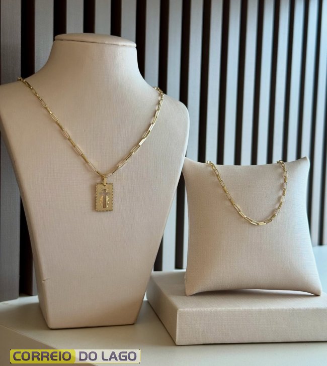 A loja também oferece uma seleção especial de joias em prata e ouro. São anéis delicados, conjuntos completos com colar, pulseira e pingentes de coração, além de peças em ouro 16k e 416k que unem brilho, modernidade e romantismo. Há ainda opções masculinas, como correntes, pulseiras e anéis que expressam força, fé e bom gosto.