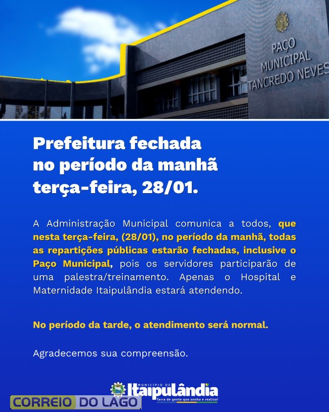 A Prefeitura de Itaipulândia informa à comunidade que, nesta terça-feira (28), todas as repartições públicas, incluindo o Paço Municipal, estarão fechadas no período da manhã.