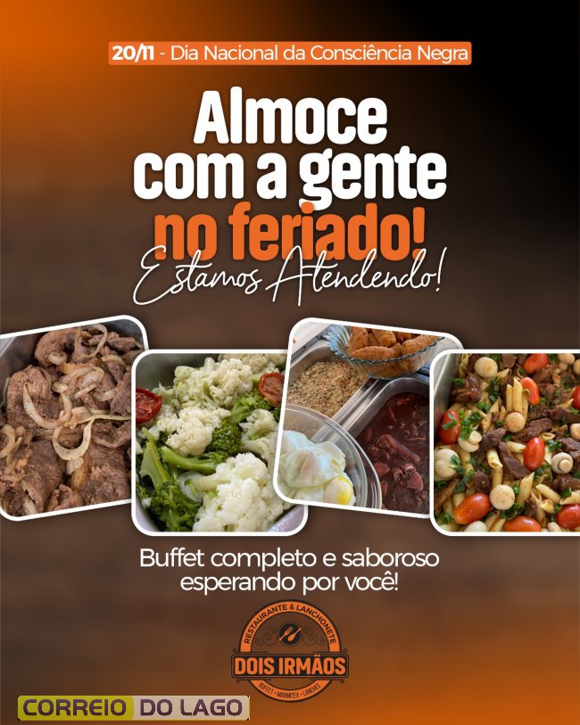 O Restaurante Dois Irmãos convida todos a visitarem nesta quinta-feira e experimentarem o melhor almoço da cidade. Aproveite o feriado para descansar e saborear pratos preparados especialmente para você.