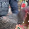 Um dos galos, que foi retirado de uma caixa de transporte, estava bastante machucado e ensanguentado, com suspeita de cegueira.