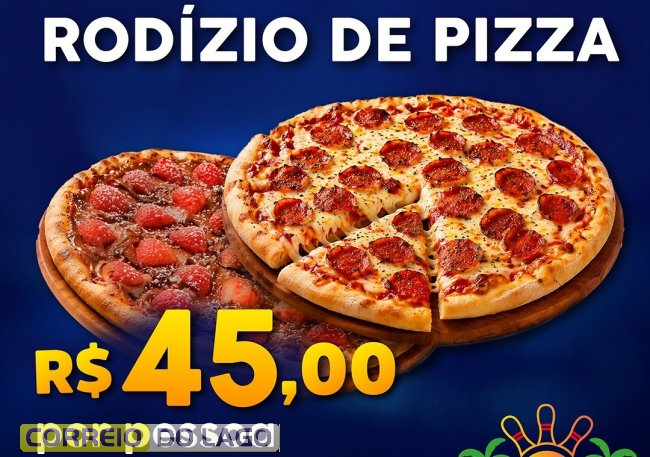O valor é de R$ 45 por pessoa, com variedade de sabores entre pizzas salgadas e doces, além dos acompanhamentos inclusos no rodízio.