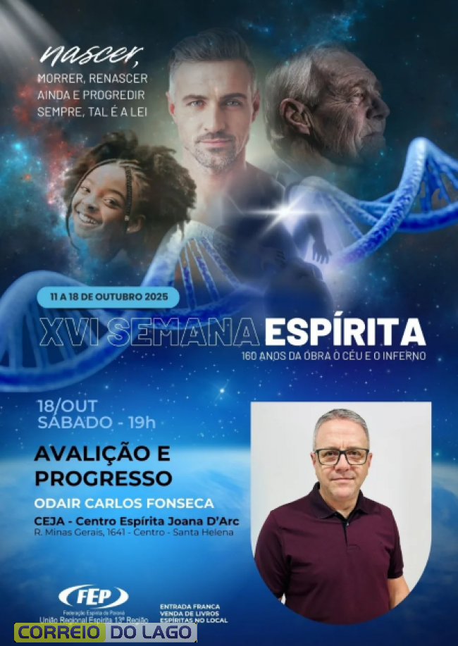 O Centro Espírita Joana D’Arc de Santa Helena, recebe no sábado (18) às 19h, último dia desta semana especial, o palestrante Odair Carlos Fonseca, com a palestra intitulada Avaliação e Progresso.