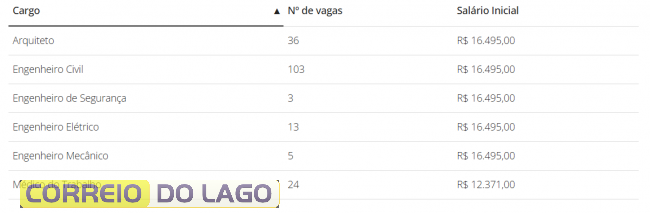 Ao todo, são 184 vagas distribuídas entre seis cargos. A maior parte é para engenheiros civis, mas também há oportunidades para arquitetos e médicos do trabalho. Os salários variam de R$ 12.371,00 a R$ 16.495,00.