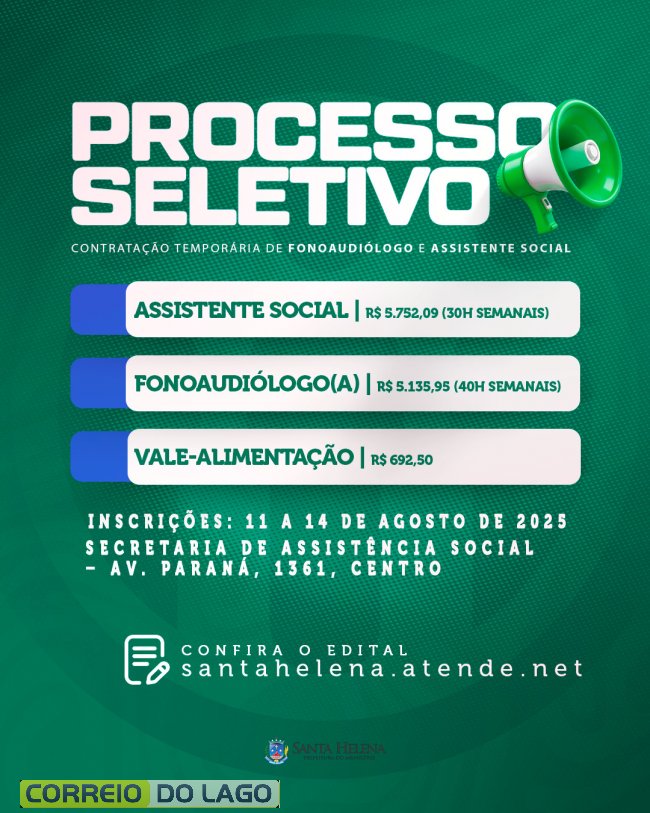 A Prefeitura de Santa Helena publicou edital de Processo Seletivo Simplificado (PSS) para contratação temporária de profissionais nas áreas de Fonoaudiologia e Serviço Social. O objetivo é atender demandas emergenciais e excepcionais da Administração Pública Municipal. O prazo de validade do PSS é de um ano, podendo ser prorrogado por igual período.