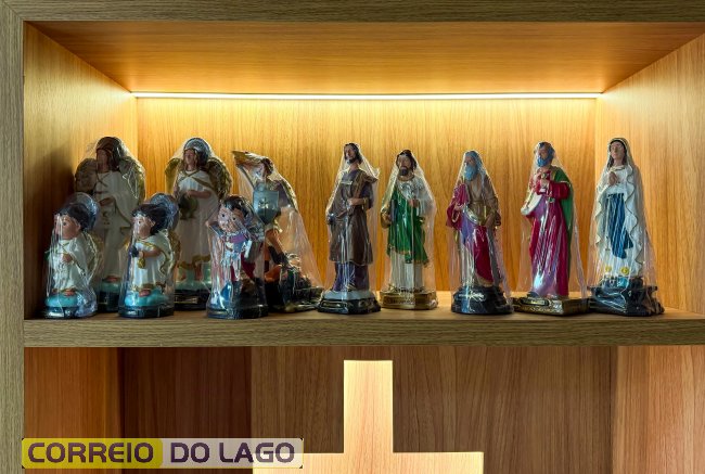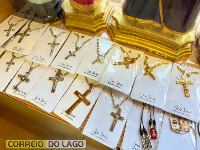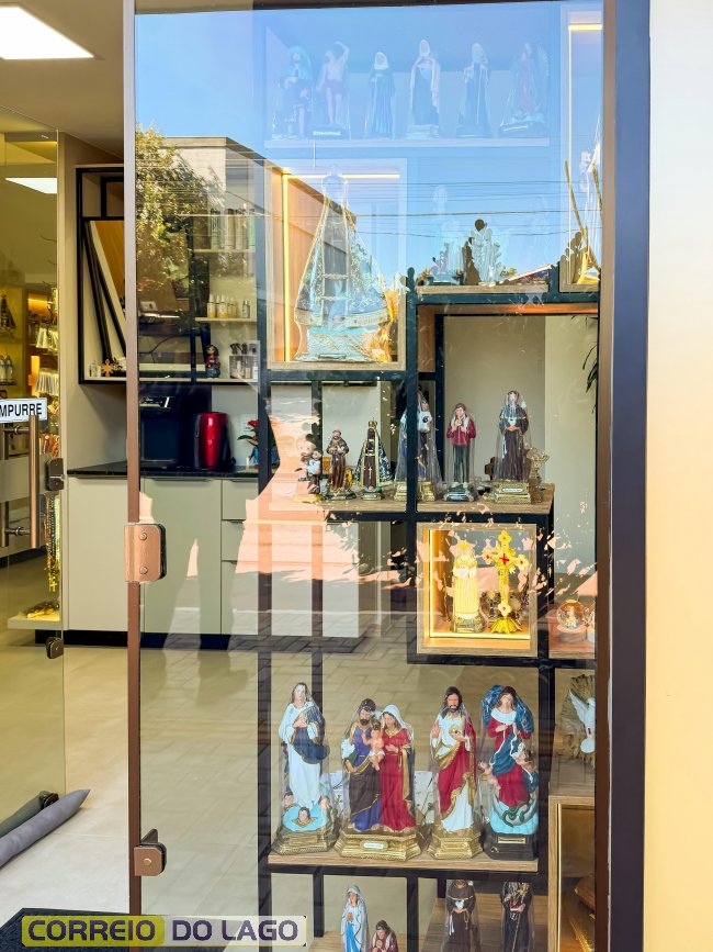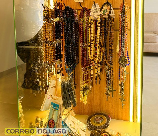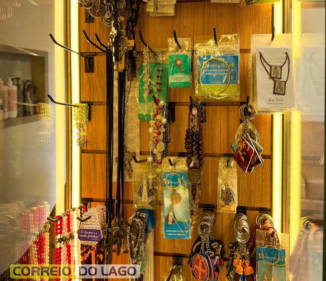 O estabelecimento, que funciona anexo ao salão de beleza, disponibiliza desde imagens de santos até chaveiros, terços e diversos outros itens.