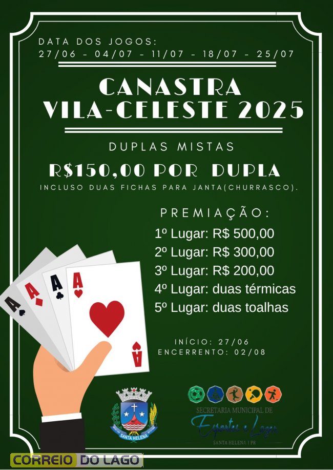 O tradicional Campeonato de Canastra de Duplas Mistas 2025 terá início nesta sexta-feira (27), às 19h15, no Clube do distrito da Vila Celeste, em Santa Helena. A competição promete movimentar os apaixonados pelo jogo de cartas, reunindo participantes de várias localidades em um ambiente de confraternização e disputa saudável.