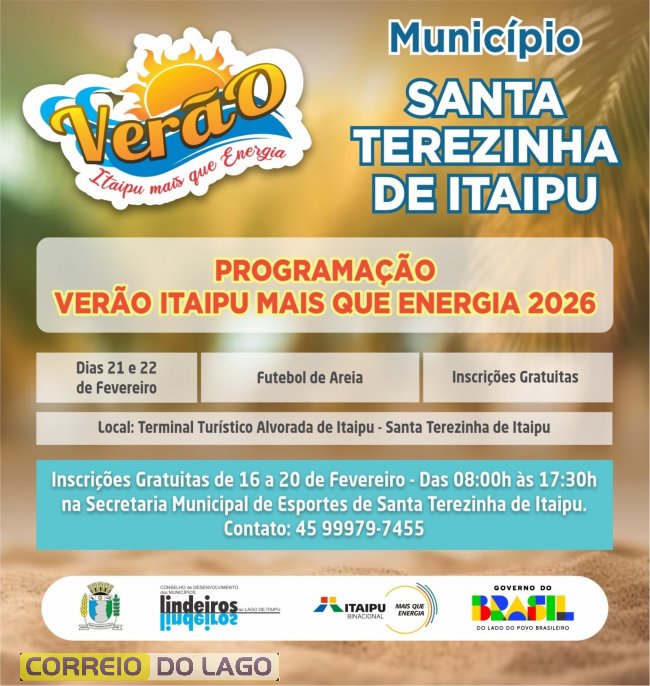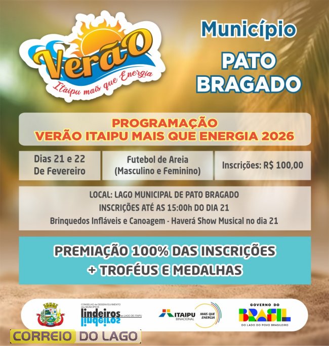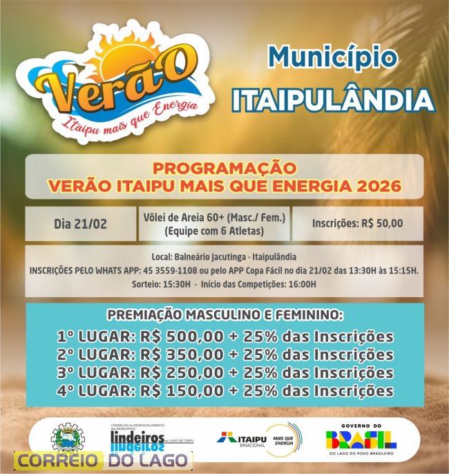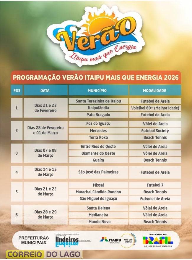 A abertura oficial acontece nos dias 21 e 22 de fevereiro em Itaipulândia, Pato Bragado e Santa Terezinha de Itaipu, com competições esportivas, atividades recreativas e atrações culturais. Em Itaipulândia, o destaque será o Vôlei de Areia 60+ no Balneário Jacutinga. Já Pato Bragado sediará o Futebol de Areia no Lago Municipal, além de brinquedos infláveis, canoagem e show musical. Em Santa Terezinha de Itaipu, o Futebol de Areia movimenta o Terminal Turístico Alvorada de Itaipu, com inscrições gratuitas.