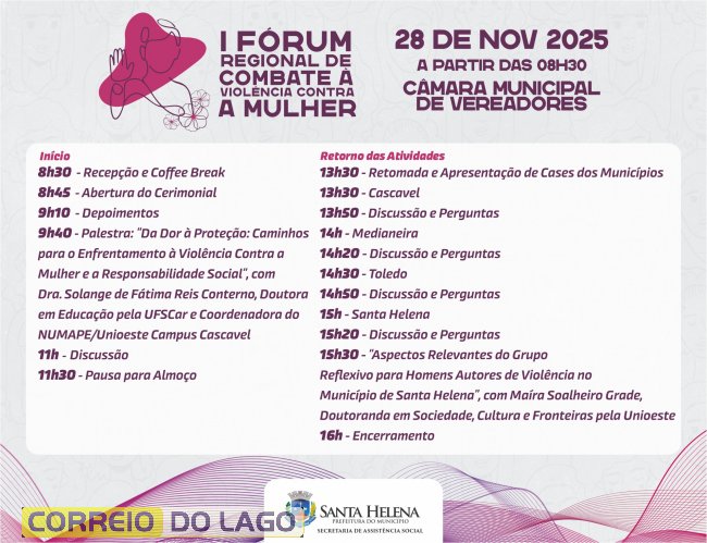 Às 15h30, Maíra Soalheiro Grade, doutoranda em Sociedade, Cultura e Fronteiras pela Unioeste, apresentará o tema “Aspectos Relevantes do Grupo Reflexivo para Homens Autores de Violência no Município de Santa Helena”. O fórum será finalizado às 16h, consolidando-se como um marco regional na articulação de políticas públicas voltadas à proteção e ao fortalecimento das mulheres.