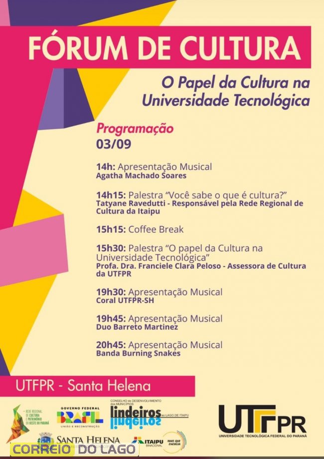 O Campus da Universidade Tecnológica Federal do Paraná (UTFPR), em Santa Helena, se prepara para sediar, no próximo dia 3 de setembro, o Fórum de Cultura, que terá como tema central “O papel da cultura na Universidade Tecnológica”. O evento é aberto ao público e oferecerá certificado de participação, além de uma programação diversificada com palestras e atrações musicais.