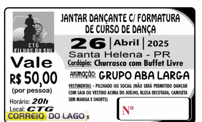 Neste sábado (26), o CTG Filhos do Sul, em Santa Helena, será palco de uma noite especial: o jantar dançante com formatura do curso de dança gaúcha de salão. O evento começa às 20h e promete reunir famílias e amigos em uma celebração animada e culturalmente rica.