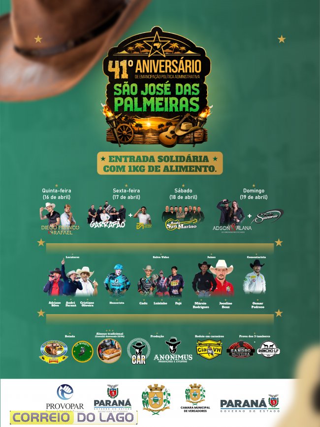 O município de São José das Palmeiras prepara uma programação diversificada para comemorar o seu 41º aniversário de emancipação político-administrativa. As festividades ocorrerão entre quinta-feira (16) e domingo (19), reunindo atrações como rodeios, provas campeiras, shows musicais e atividades para toda a família.