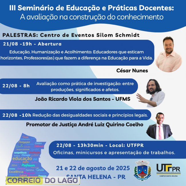 O III Seminário de Educação e Práticas Docentes terá início nesta quinta-feira (21) em Santa Helena. O evento é uma realização da Secretaria Municipal de Educação e Cultura em parceria com a Universidade Tecnológica Federal do Paraná – Campus Santa Helena (UTFPR-SH) e segue até sexta-feira (22).
