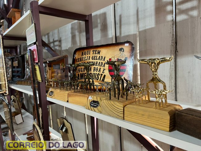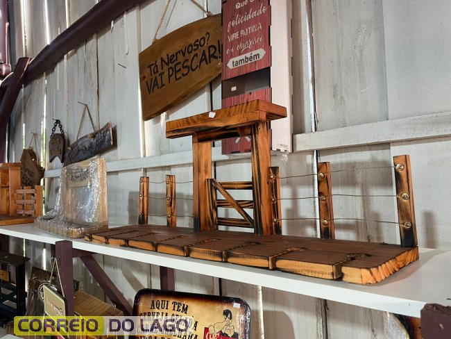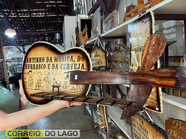 Entre os destaques estão os porta-espetos, disponíveis em modelos rústicos e também em versões práticas para fixação na parede, trazendo organização e um toque especial ao ambiente.