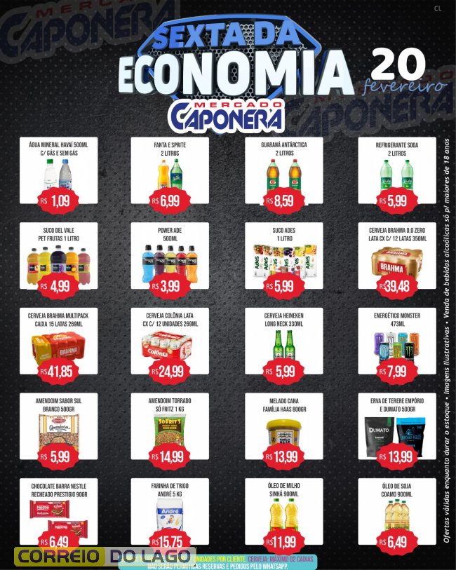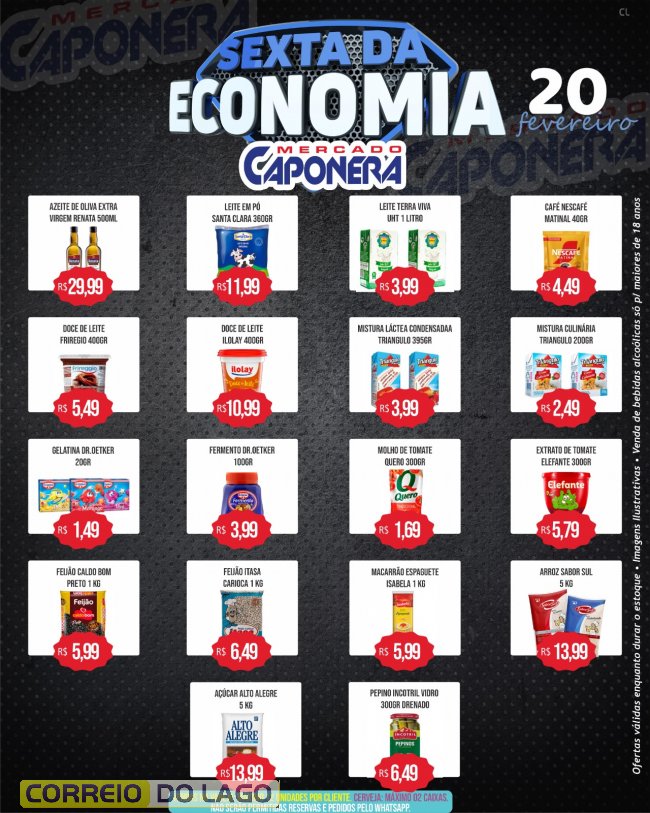 Nesta sexta-feira (19), o Mercado e Açougue Caponera realiza mais uma edição do Super Dia C, com preços reduzidos em diversos produtos para quem quer economizar nas compras do Carnaval. Ofertas em itens do dia a dia e no açougue, garantindo mais praticidade e economia para abastecer a casa antes da folia. Promoções válidas apenas nesta sexta ou enquanto durarem os estoques.
