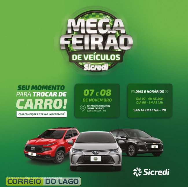 O Sicredi de Santa Helena promoverá nos dias 7 e 8 de novembro o Mega Feirão de Veículos, que acontecerá em frente ao Centro Social Católico. O evento é uma oportunidade para quem deseja trocar de carro com condições especiais e taxas exclusivas.