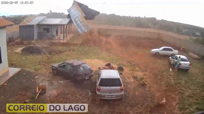 Imagens de câmera de segurança mostram o momento em que uma forte rajada de vento atinge uma propriedade rural, arrancando completamente o telhado em poucos segundos. Duas pessoas que estavam no local aparecem se protegendo atrás de um carro enquanto a estrutura é levada pelo vento.