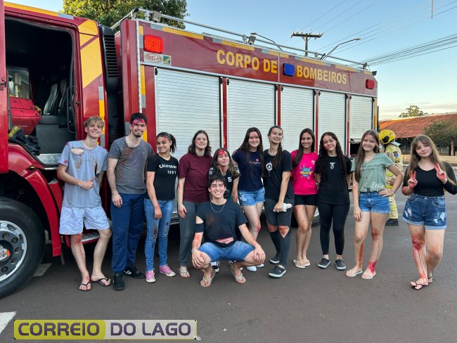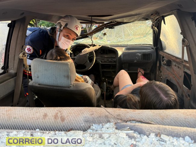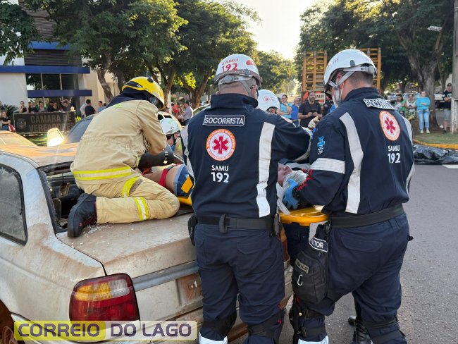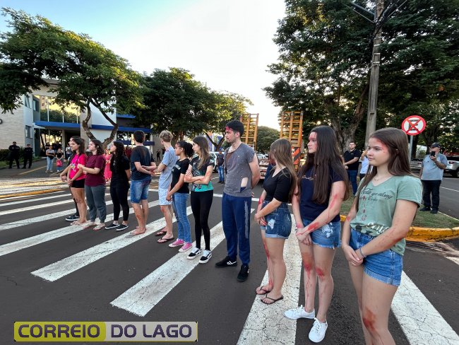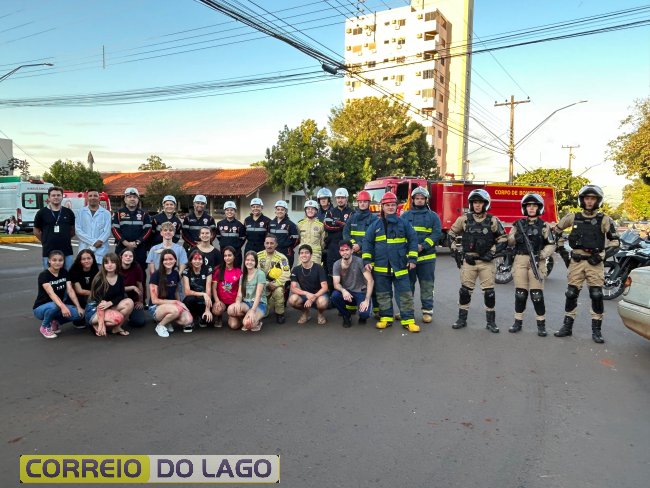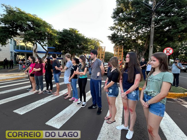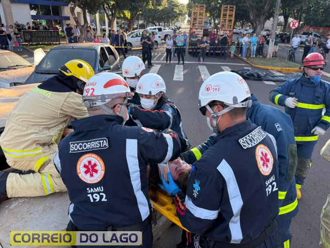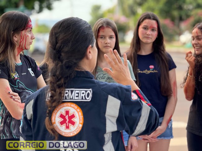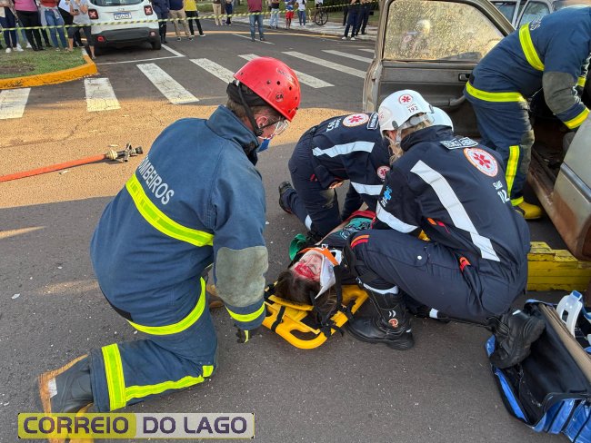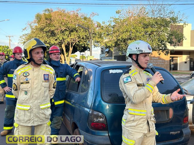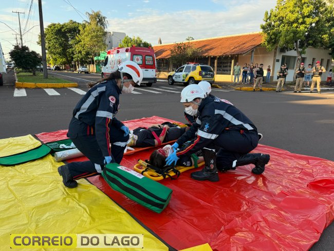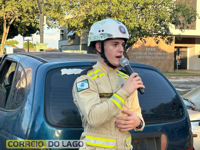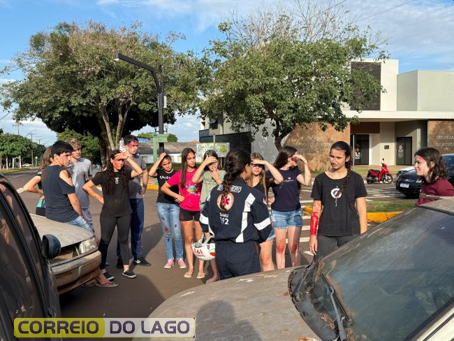 A ação aconteceu em frente à Câmara de Vereadores, no cruzamento das avenidas Paraná e Deputado Arnaldo Busato, onde três veículos foram posicionados para representar um acidente de trânsito. Alunos do Colégio Cívico-Militar Graciliano Ramos participaram da encenação como vítimas.