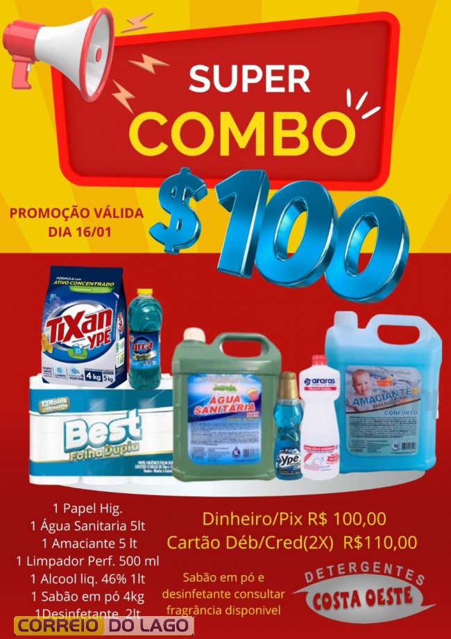 O valor do combo é de R$ 100,00 para pagamento em dinheiro ou Pix, e R$ 110,00 no cartão de débito ou crédito, com opção de parcelamento em até duas vezes. Aproveite a promoção e garanta o seu super combo na Detergentes Costa Oeste, em Santa Helena.