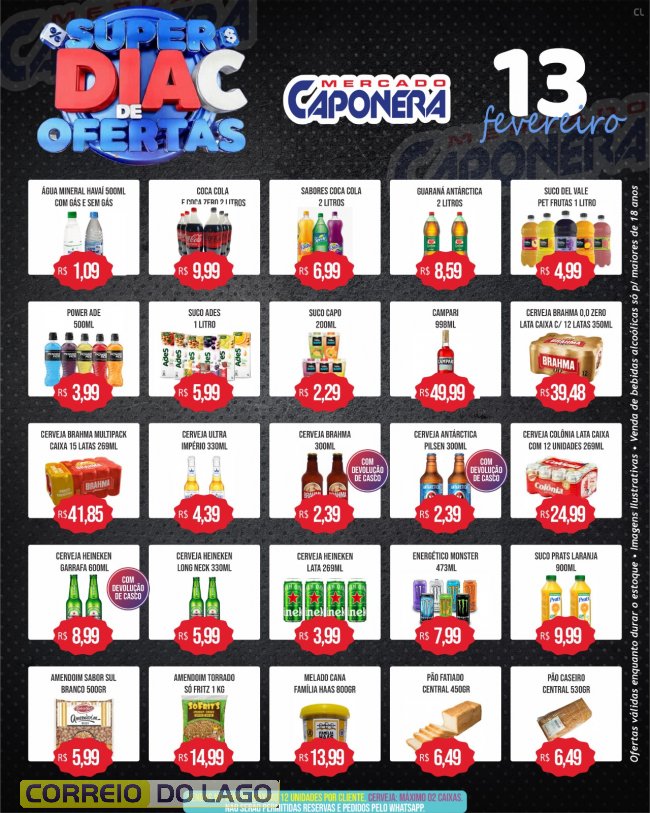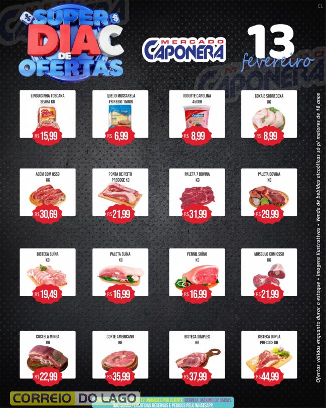 Nesta sexta-feira (13), o Mercado e Açougue Caponera realiza mais uma edição do Super Dia C, com preços reduzidos em diversos produtos para quem quer economizar nas compras do Carnaval.Ofertas em itens do dia a dia e no açougue, garantindo mais praticidade e economia para abastecer a casa antes da folia. Promoções válidas apenas nesta sexta ou enquanto durarem os estoques.
