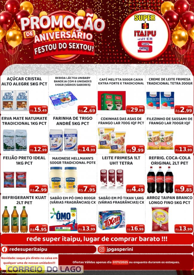 Para comemorar o mês de aniversário, Super Itaipu e Super Santa Helena lançam a promoção “Festou do Sextou”. Nesta sexta-feira (7), clientes poderão aproveitar produtos selecionados por apenas R$ 1, R$ 2 ou R$ 3, em uma oferta válida enquanto durarem os estoques. É a oportunidade perfeita para garantir economia e aproveitar os melhores preços da rede.