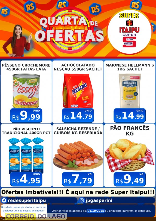 Nesta quarta-feira (01), o Super Itaipu e o Super Santa Helena apresentam promoções especiais em diversos produtos, garantindo economia para toda a família. É a chance de aproveitar preços reduzidos e levar para casa itens de qualidade com descontos imperdíveis.