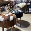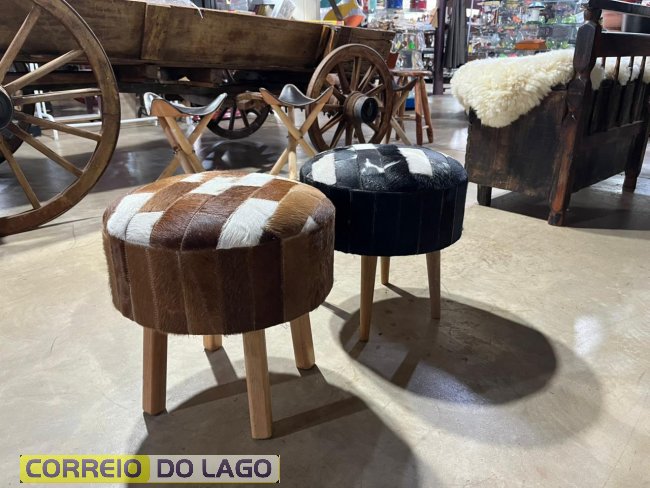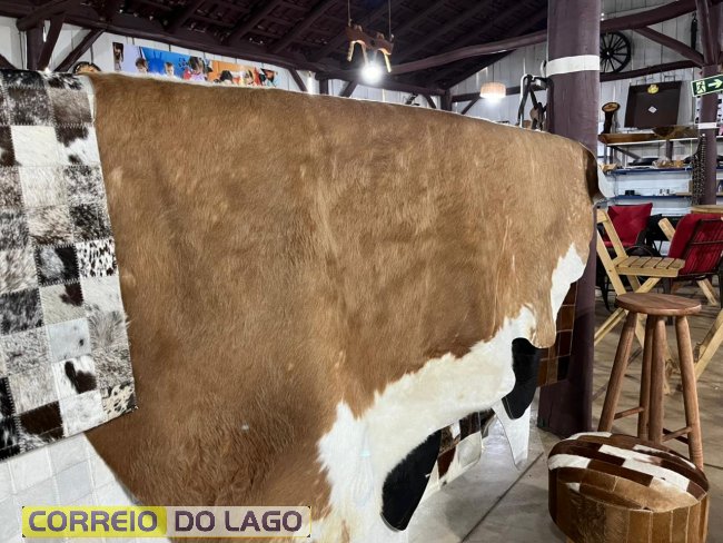 Entre os destaques estão tapetes de couro de boi inteiro, disponíveis em várias cores, além de modelos com padrão xadrez. A loja também conta com passadeiras, puffs e cadeiras revestidos em couro, ideais para valorizar a decoração.