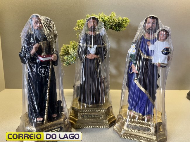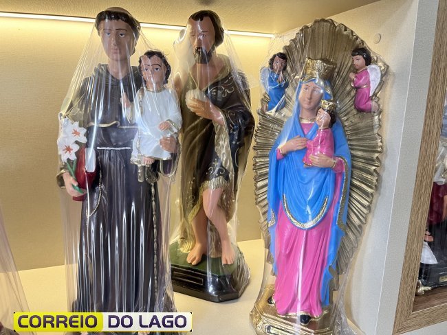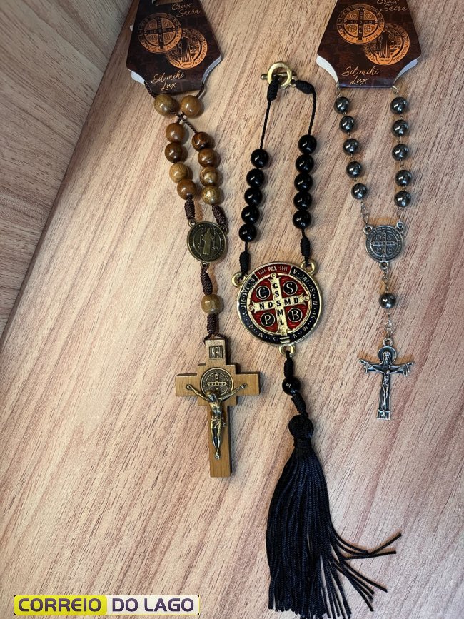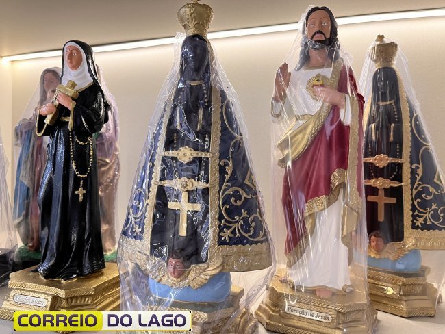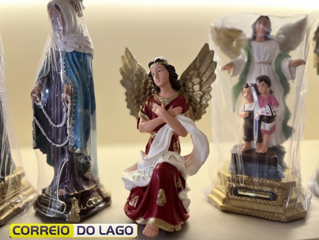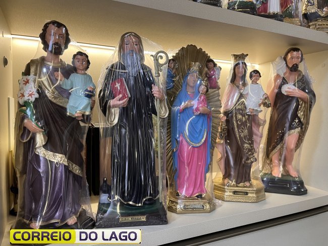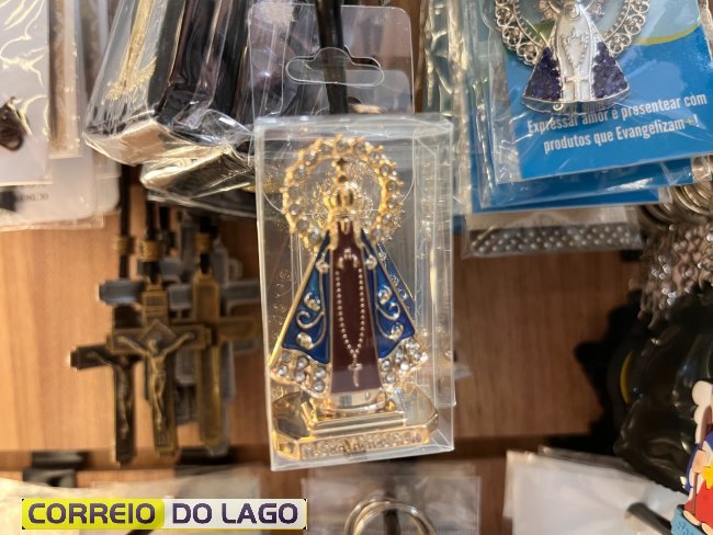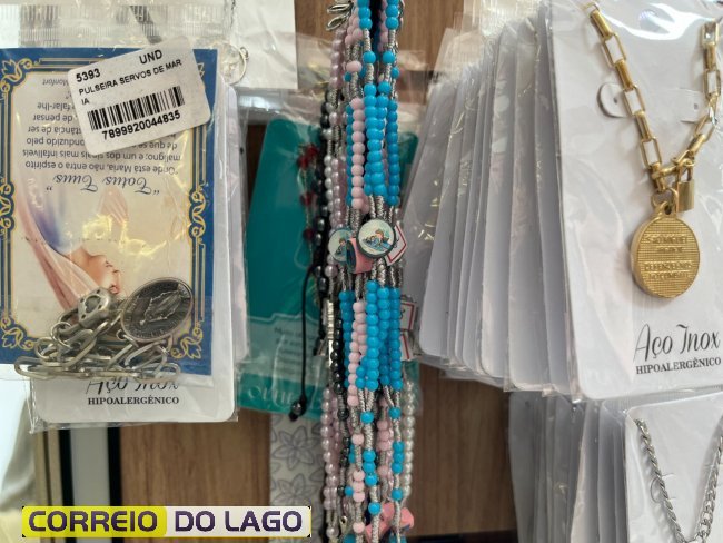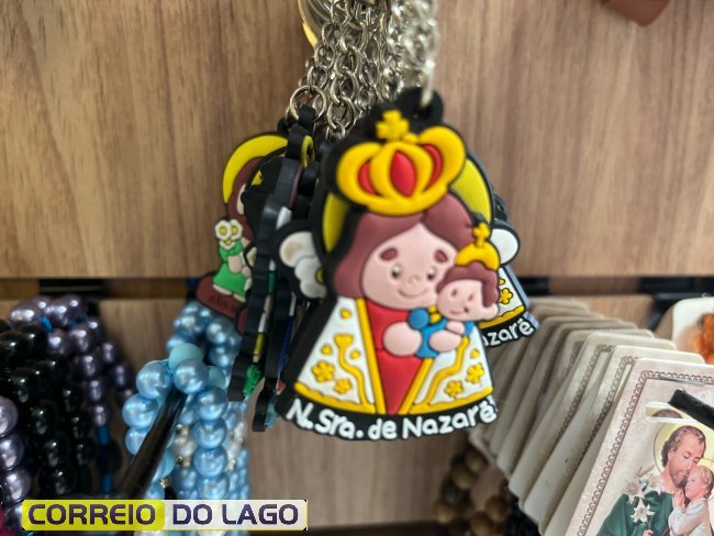 Na loja é possível encontrar imagens de santos, anjos e diferentes modelos de terços, que também podem ser usados de várias formas no dia a dia. Alguns preferem o terço como pulseira, outros escolhem colares com pingente ou chaveiros, pequenas formas de carregar a fé sempre por perto.