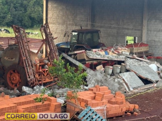 Ainda na mesma propriedade rural, a força dos ventos derrubou a parede de um barracão sobre máquinas agrícolas, deixando danos na plantadeira e pulverizador.