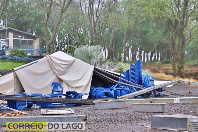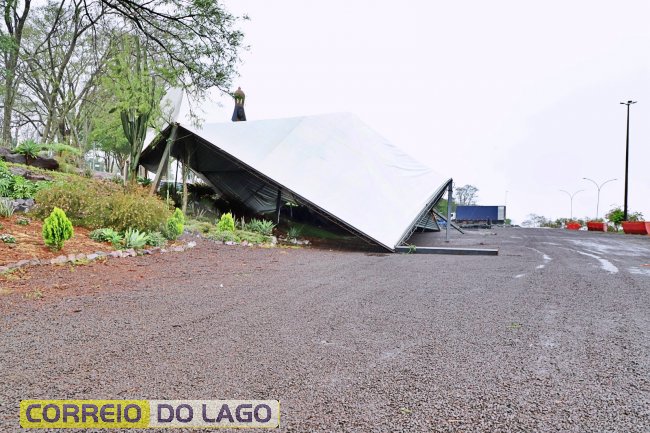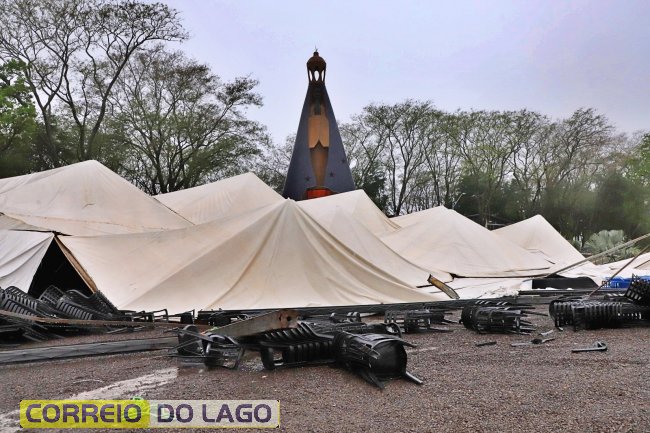 Na manhã desta terça-feira (30), um temporal com fortes rajadas de vento atingiu a região do Monumento de Nossa Senhora Aparecida, em Itaipulândia, e destruiu parte da estrutura montada para as celebrações da Semana da Padroeira.
