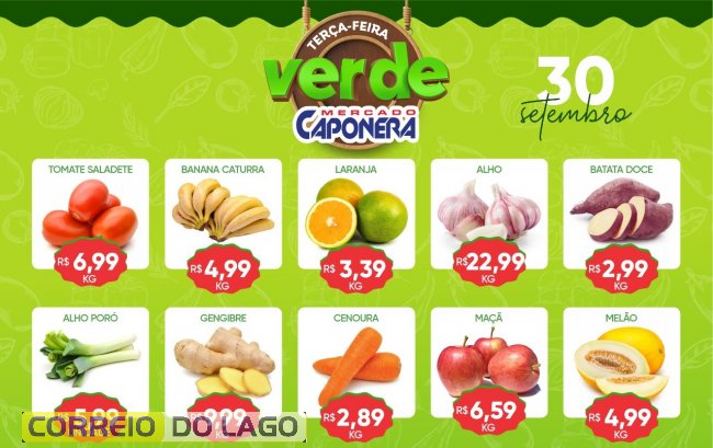 O Mercado Caponera realiza nesta terça-feira (30) mais uma edição da Terça Verde, com promoções imperdíveis na seção de hortifruti. A oportunidade para quem busca produtos frescos, saudáveis e de qualidade.