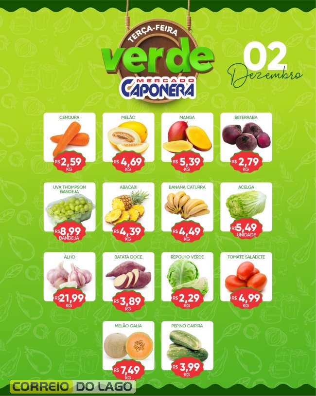 Nesta terça-feira (02), o Mercado Caponera de Santa Helena tem ofertas no Terça Verde, trazendo uma seleção de hortifruti fresquinho, com frutas, verduras e legumes de qualidade.