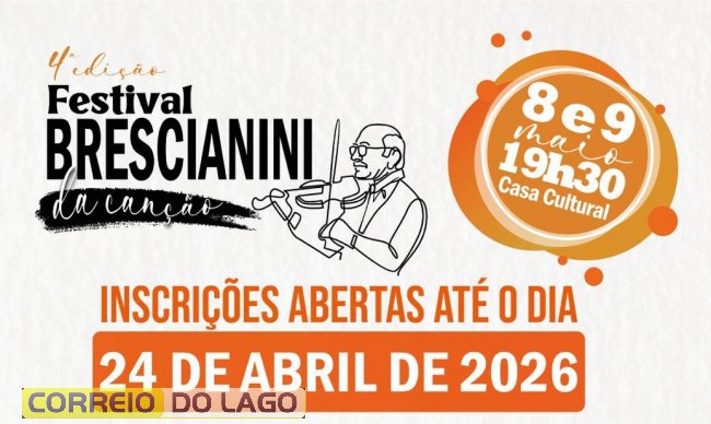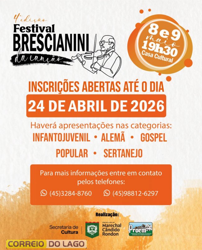 Terminam nesta sexta-feira (24), às 17h, as inscrições para o 4º Festival Brescianini da Canção, promovido pela Prefeitura de Marechal Cândido Rondon, por meio da Secretaria de Cultura e da PROEM (Fundação Promotora de Eventos).