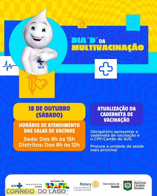 A prefeitura de Marechal Cândido Rondon, por meio da Secretaria Municipal de Saúde, realiza neste sábado, 18 de outubro, o Dia “D” da Campanha de Multivacinação 2025, com o objetivo de mobilizar pais e responsáveis para levarem crianças e adolescentes menores de 15 anos às salas de vacina do município e distritos.