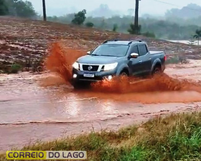 Segundo informações apuradas, o grande volume de água desceu com intensidade pelas lavouras, arrastando terra e detritos em uma enxurrada que acabou cobrindo completamente a pista em determinados pontos.