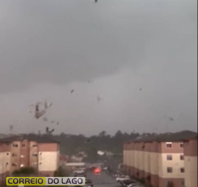Nas imagens, é possível ver o avanço do tornado e a destruição provocada em poucos instantes. Partes de telhados de residências são arrancadas e chegam a voar pelo céu, evidenciando a intensidade dos ventos que atingiram a região. O registro chama a atenção pela violência do fenômeno e pelo cenário de destruição formado rapidamente.
